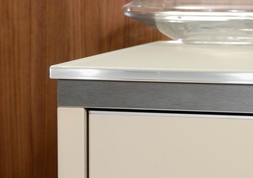 Die Platte besteht aus 12 mm Sicherheitsglas. Sie ist dauerhaft mit einer beschichtete Leichbau-Trägerplatte verbunden. Daraus ergiebt sich eine übliche Gesamtdicke von ca. 40 mm. Ihren Farbton erhält die Glasarbeitsplatte durch eine auf der Unterseite bei 650° Celsius eingebrannte keramische Beschichtung. Sie gibt es Standardmässig in 12 Trendfarben.
